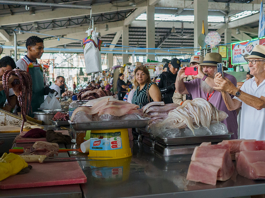 Con la ayuda de un guía turístico, los viajeros recorrieron y conocieron de cerca el nombre de las especies, legumbres, frutas y platos típicos que se expenden en el mercado. También les explicaron el concepto de la “yapa” durante las compras.
