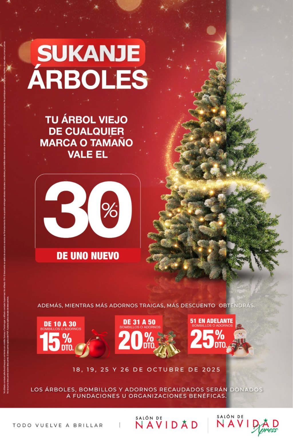 Aprovecha dos fines de semana para cambiar tu árbol y adornos de Navidad con la promoción Sukanje Árboles de Salón de Navidad y Sukasa, te esperamos el 18 y 19 y el 25 y 26 de octubre del 2025. Los artículos que reciba Salón de Navidad por parte de nuestros clientes:  árboles, bombillos y adornos, generarán mucha felicidad y alegría, ya que serán entregados a fundaciones y organizaciones benéficas.
