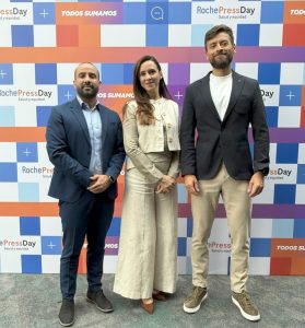 En la foto, de izquierda a derecha: Joel Hernández, Communications & Digital Partner de Roche Ecuador; Oana Matei, Gerente General...