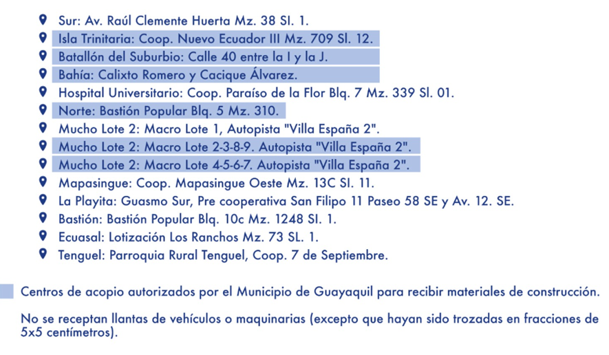 Son 14 los centros de acopio distribuidos en la ciudad, con atención los 365 días del año, seis de ellos están autorizados a receptar material de construcción. A continuación, se indican las direcciones de los centros de acopio: